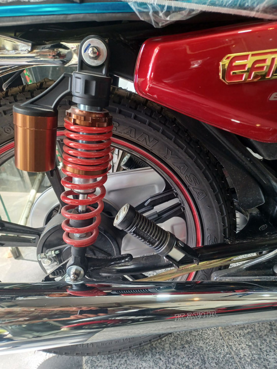 سیستم تعلیق جلو و عقب بهصورت دوشاخ تلسکوپی و کمکفنر دوقلو طراحی شده که باعث رانندگی راحتتر و کنترل بهتر در مسیرهای ناهموار میشود. - ترمز جلو و عقب: کاسهای